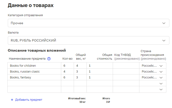 Мы отправляли только книги, поэтому в категории товара выбрали «Прочее» и в описании перечислили книги в формате «детские книги — 6 шт.», «книги, русская классика — 4 шт» и пр.: