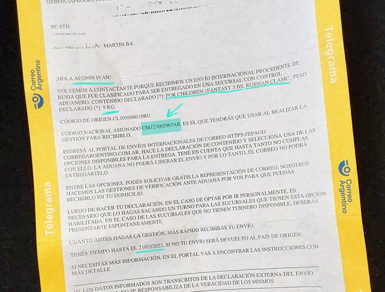 Спустя чуть более месяца после отправки нам на домашний адрес пришло письмо от Correo Argentino. Успешное получение этого письма — важнейший этап для того, чтобы посылка оказалась у вас в руках, потому что это письмо содержит важнейшую информацию о посылке, а именно присвоенный ей аргентинский трек-номер. Как ещё его узнать — мы так и не поняли. Никакое отслеживание этой информации не давало. Выглядело это письмо вот так: