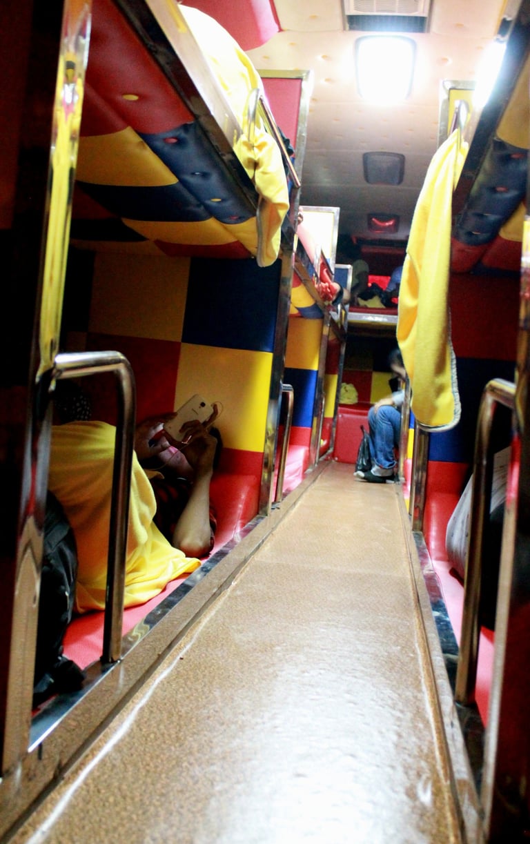 Вечером от отеля нас забирал тут-тук. Мы заехали еще в пару отелей за другими гостями. К слову, водитель заходил в каждый отель и спрашивал на ресепшене. К 23 мы были в автобусе. Нам достались первые места за водителем снизу. Даже не знаю, удобные, они или нет. Верхние места, конечно, комфортнее — они светлее и дальше от ног прохожих.