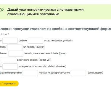 Выполнение домашней работы значительно влияет на процесс обучения. Совсем не обязательно делать её правильно и даже полностью, ведь самое важное — дать мозгу возможность ещё раз обратиться к пройденному на уроке материалу и вообще к испанскому. Домашки на интерактивной платформе — это возможность обратиться к их выполнению в любой удобный момент с любого устройства.