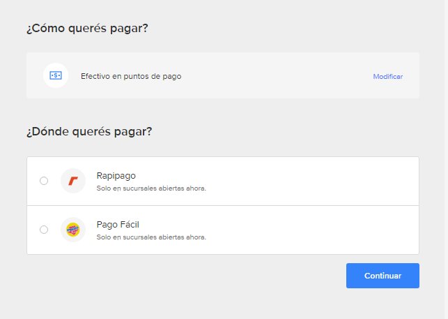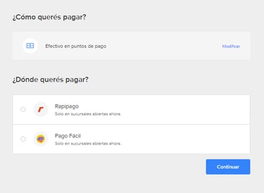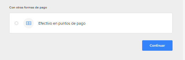 Дальше предстоит выбрать способ оплаты. Если бы у вас была местная карта, вы бы вряд ли читали этот пост, поэтому рассказываю, как купить за наличные. Просто так заказать, а потом оплатить при самовывозе нельзя, поэтому единственный вариант — оплатить в пунктах приёма платежей. Проматываем вниз и выбираем Efectivo en puntos de pago. Нажимаем Continuar.