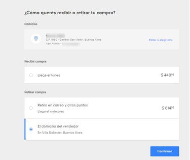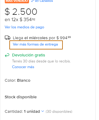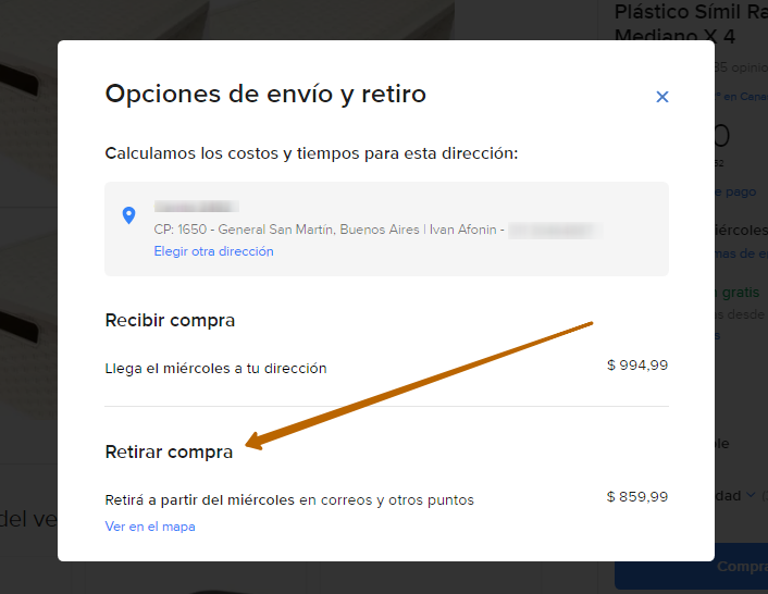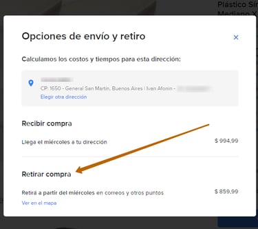 Если вы хотите забрать самовывозом, то под доставкой нажмите Ver más formas de entrega и выберите Retirar compra. Обращаю внимание, что не все магазины предоставляют такую возможность. Также некоторые магазины просят в случае самовывоза выбирать пункт Доставка по согласованию с продавцом (Entrega a acordar con el vendedor). Об этом они пишут в описании товара.