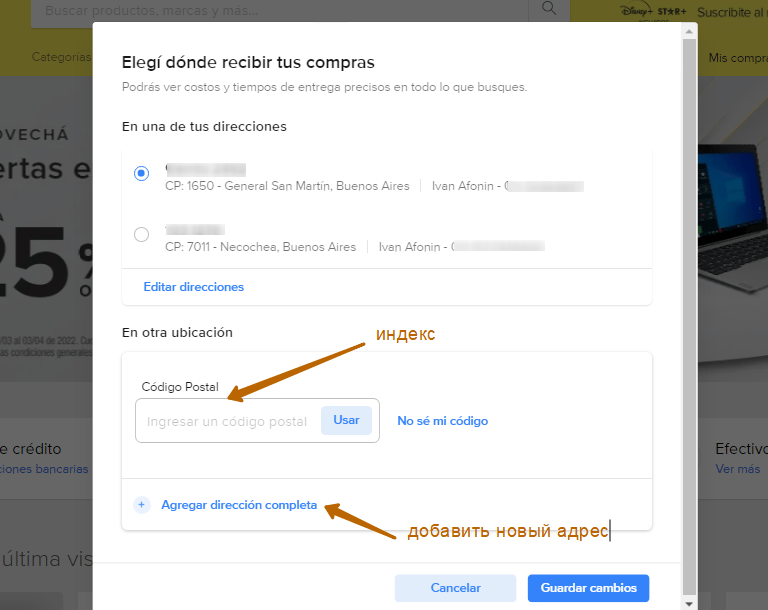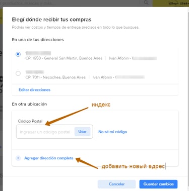 Если вы планируете забирать из пункта выдачи или хотите пока просто прикинуть сколько будет стоить доставка в ваш район, то можете ввести только индекс Codigo Postal. Если вы его не знаете, то можете нажать No sé mi codigo и откроется вот эта ссылка, где вы его узнаете :) Для доставки на дом выбираем Agregar dirección.