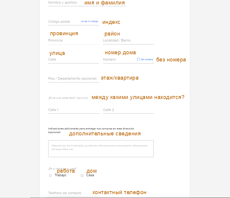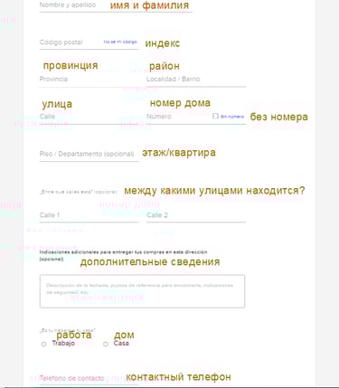Заполняем полностью адрес и нажимаем Guardar. Вся анкета с переводом на скриншоте.