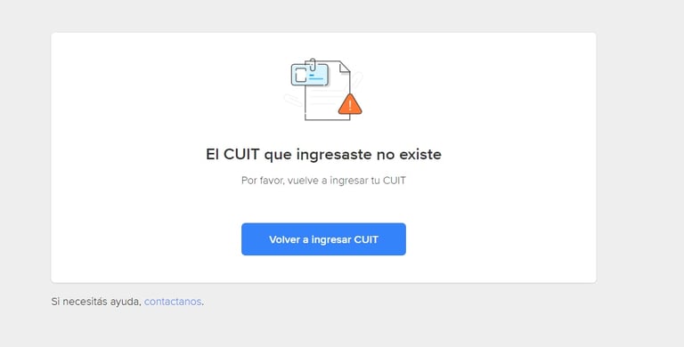 Появится сообщение, что такого налогового номера (CUIT — это как CDI, но для резидентов) не существует. Нажимаем на надпись Volver a ingresar CUIT.