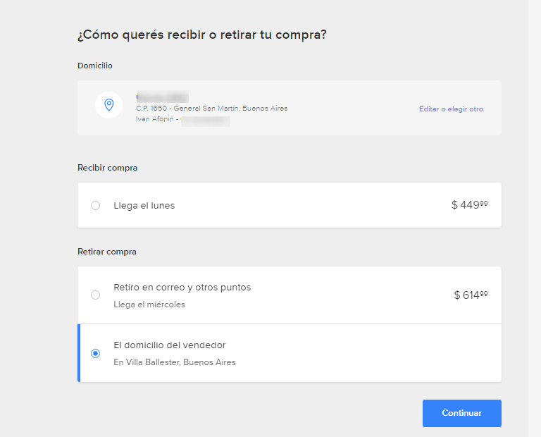 Переходим к процессу оформления заказа. Либо в корзине, либо в товаре нажимаем Comprar и выбираем подходящий способ доставки. Нажимаем Continuar.